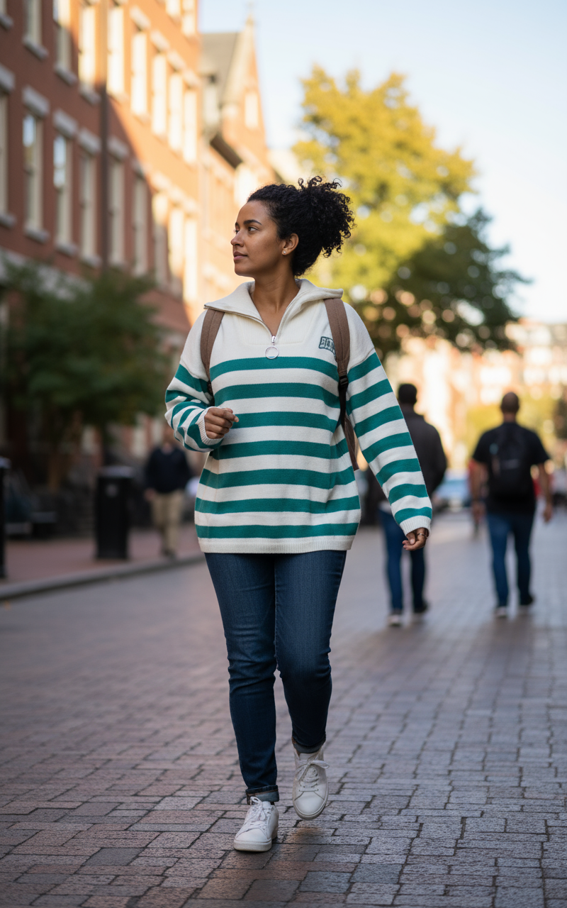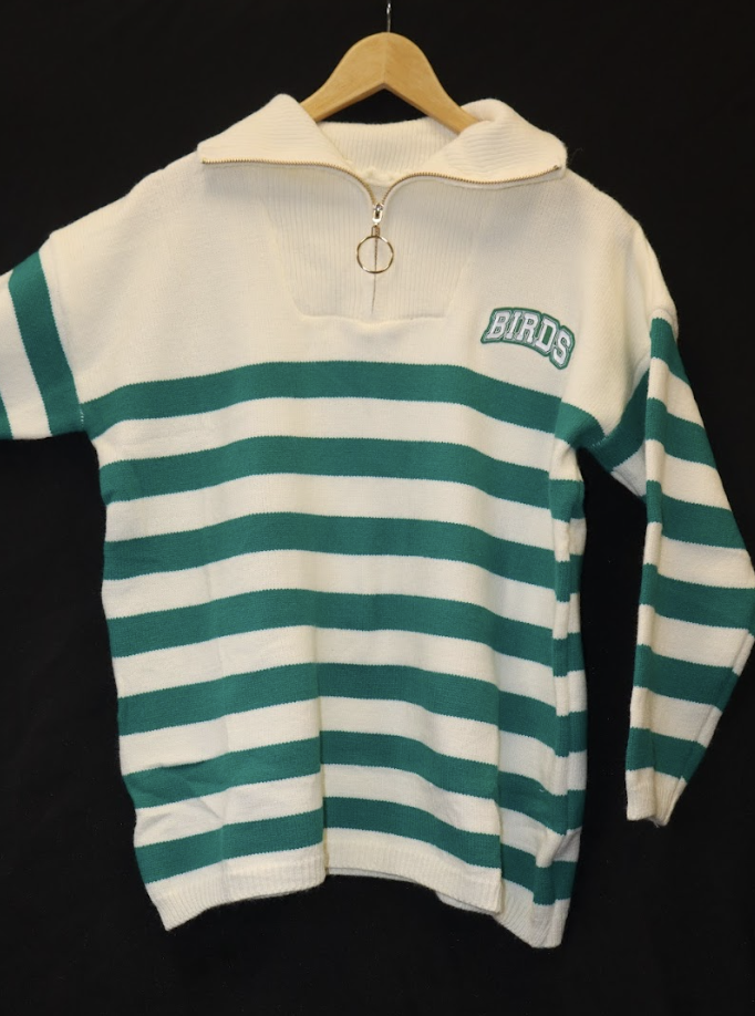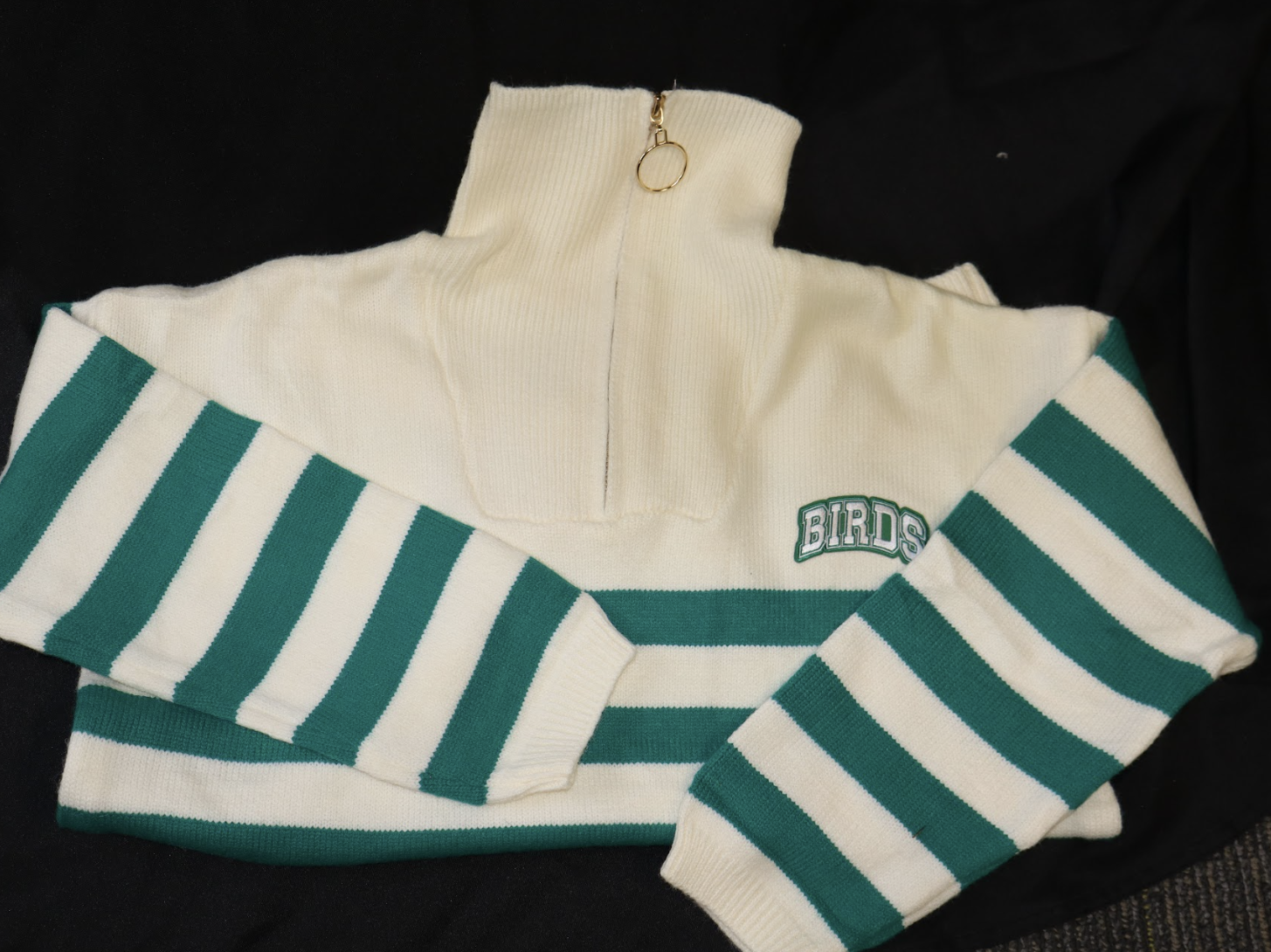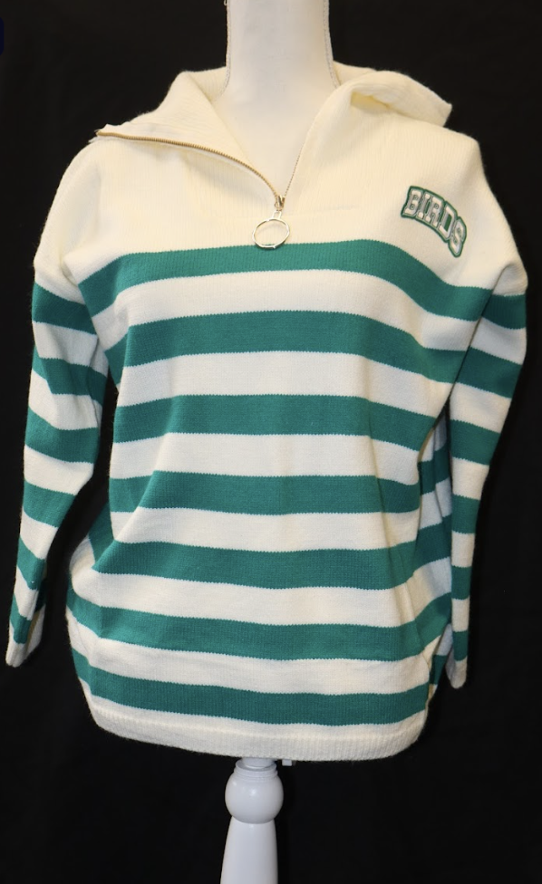 A bold, sporty knit that blends comfort with effortless game-day style. This green and white striped half-zip sweater features a gold ring zipper detail and embroidered “BIRDS” patch on the chest. Soft, lightweight, and perfect for layering, it gives classic preppy energy with a modern twist.