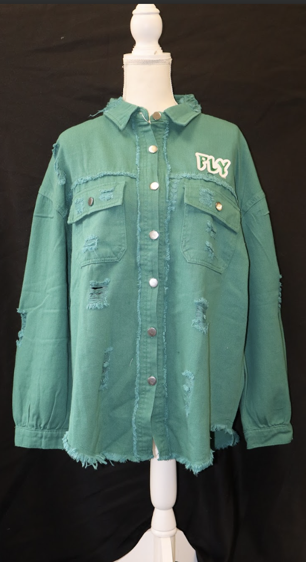 Oversized Distressed Green Denim “FLY” Button-Up