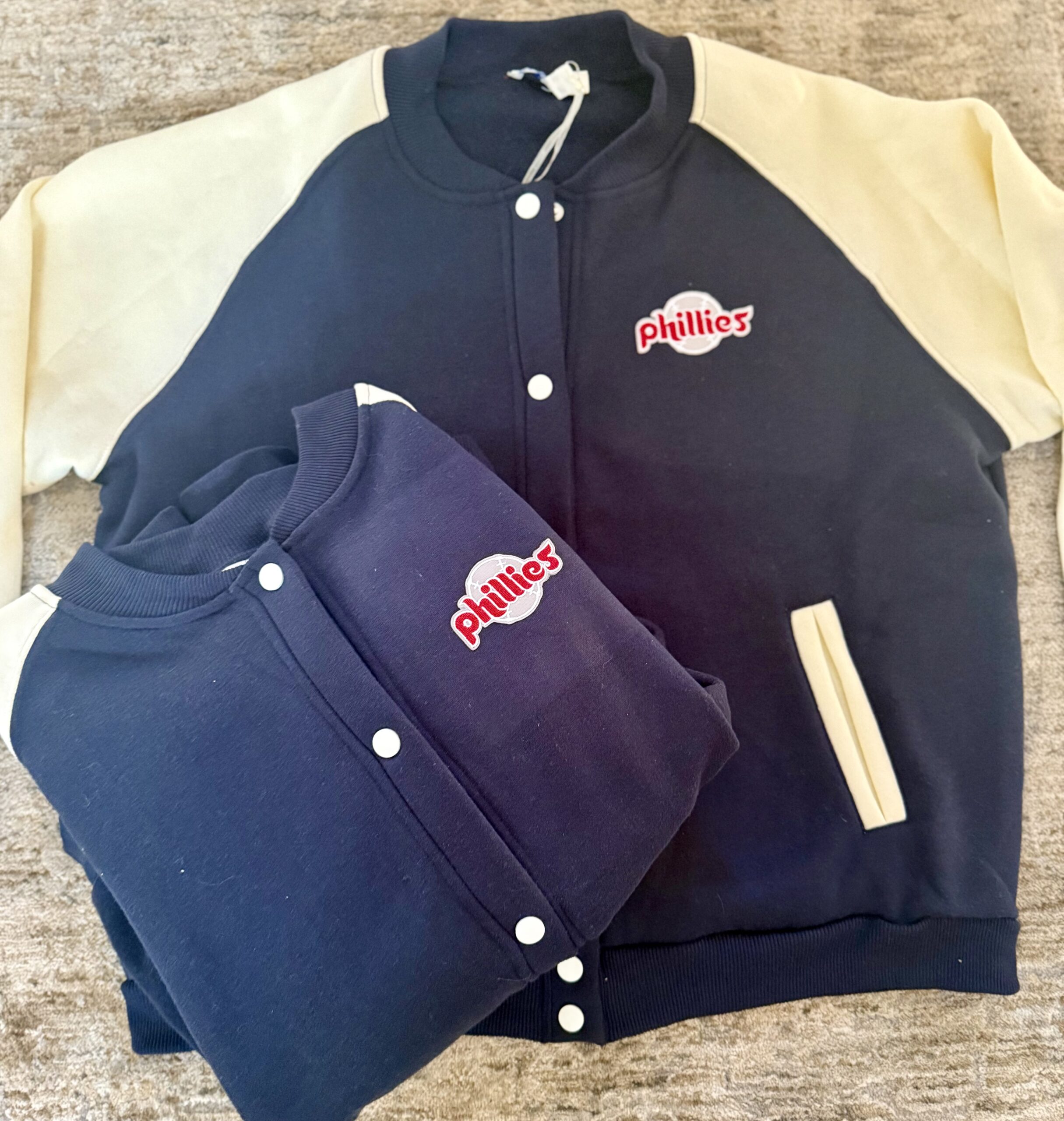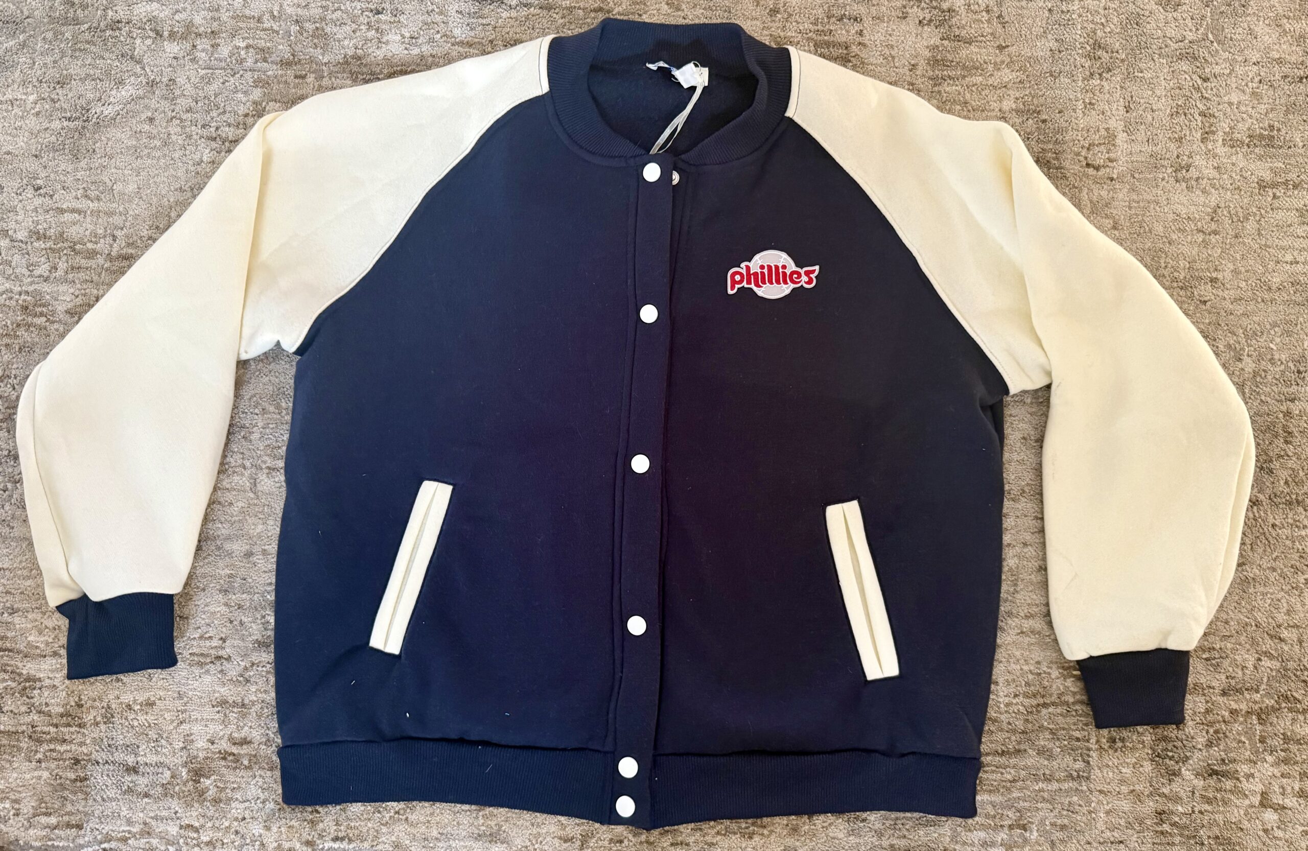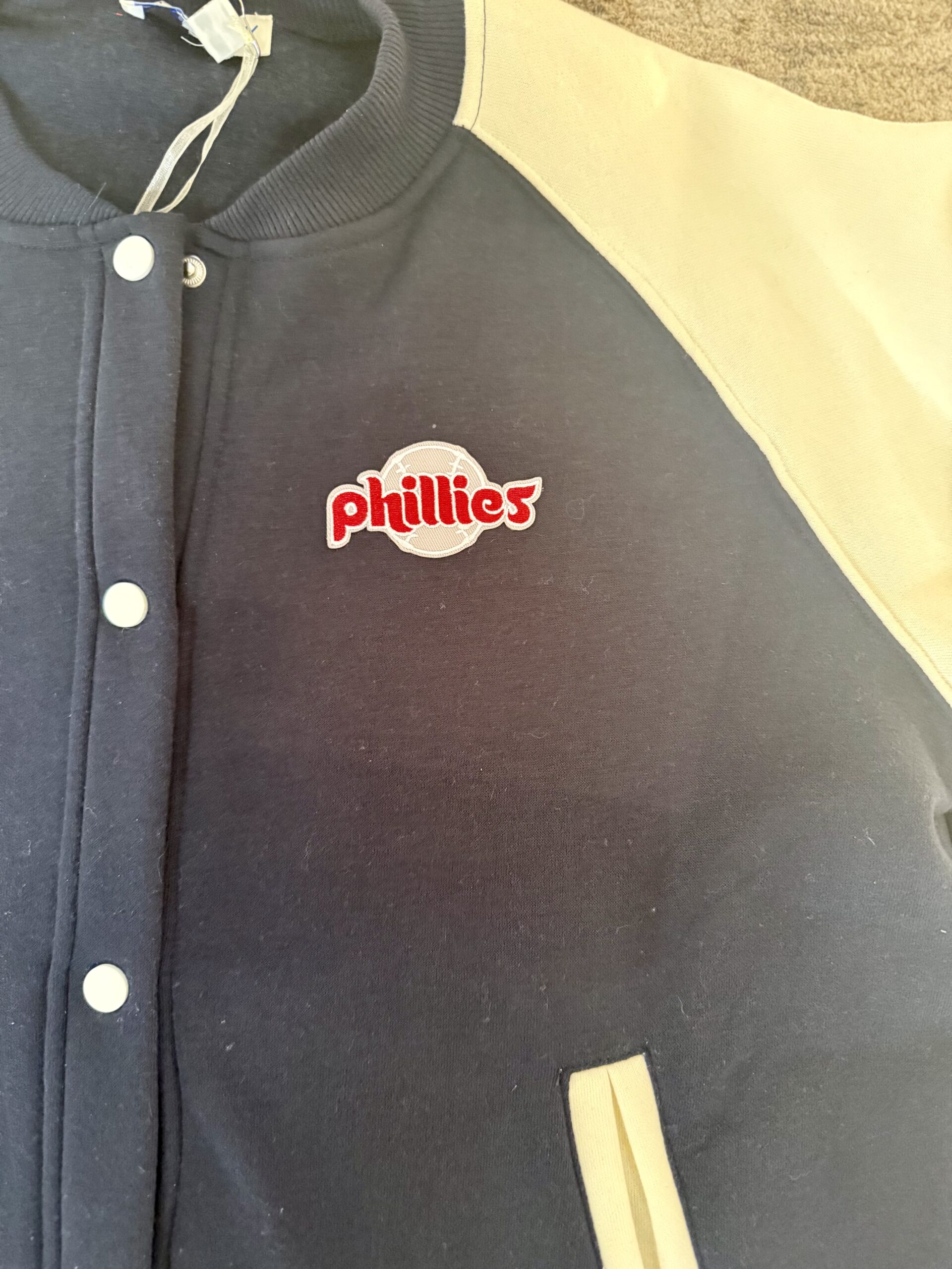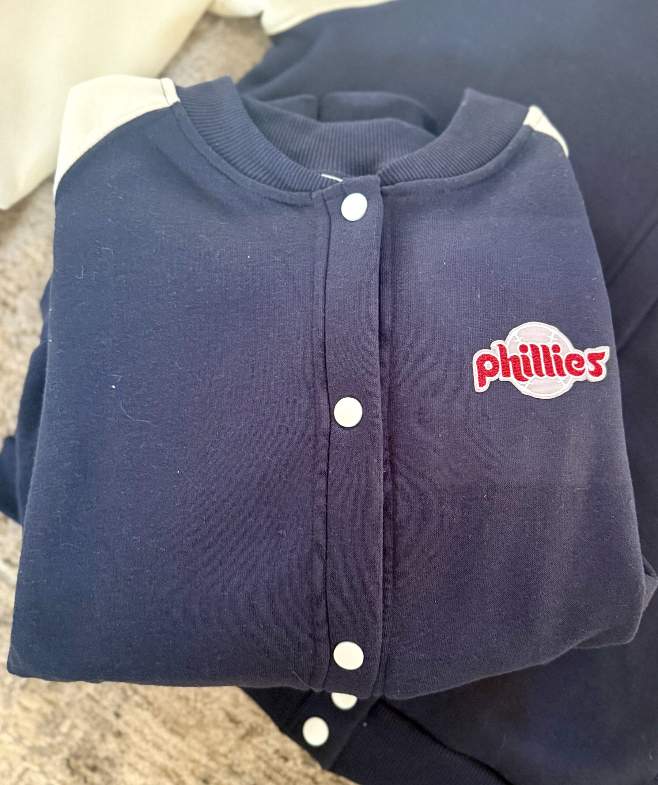 Phillies Baseball Sweatshirt- Navy and Cream with buttons. Phillies patch on left breast.