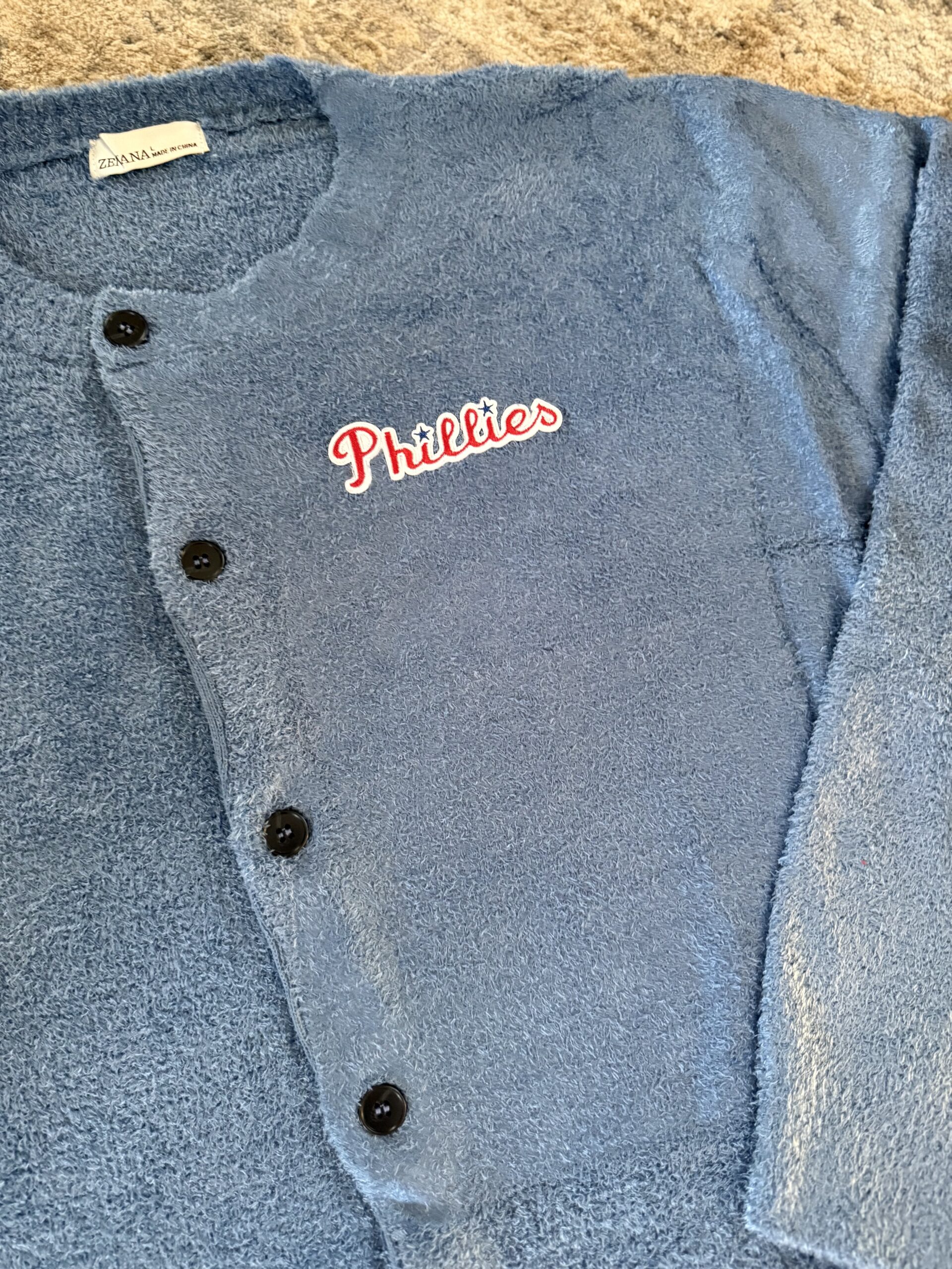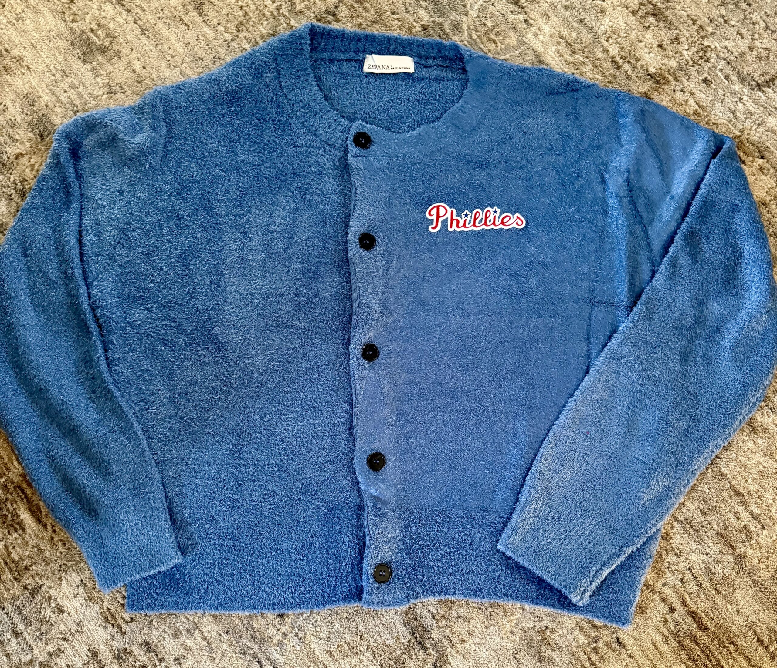 Phillies Sweater- Blue Button up with red Phillies patch