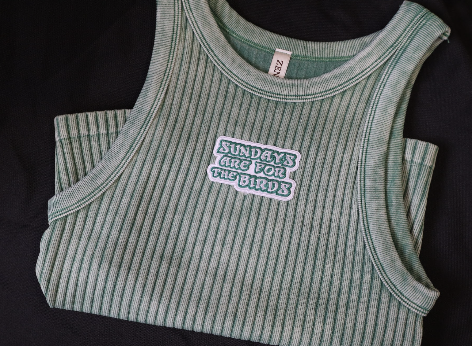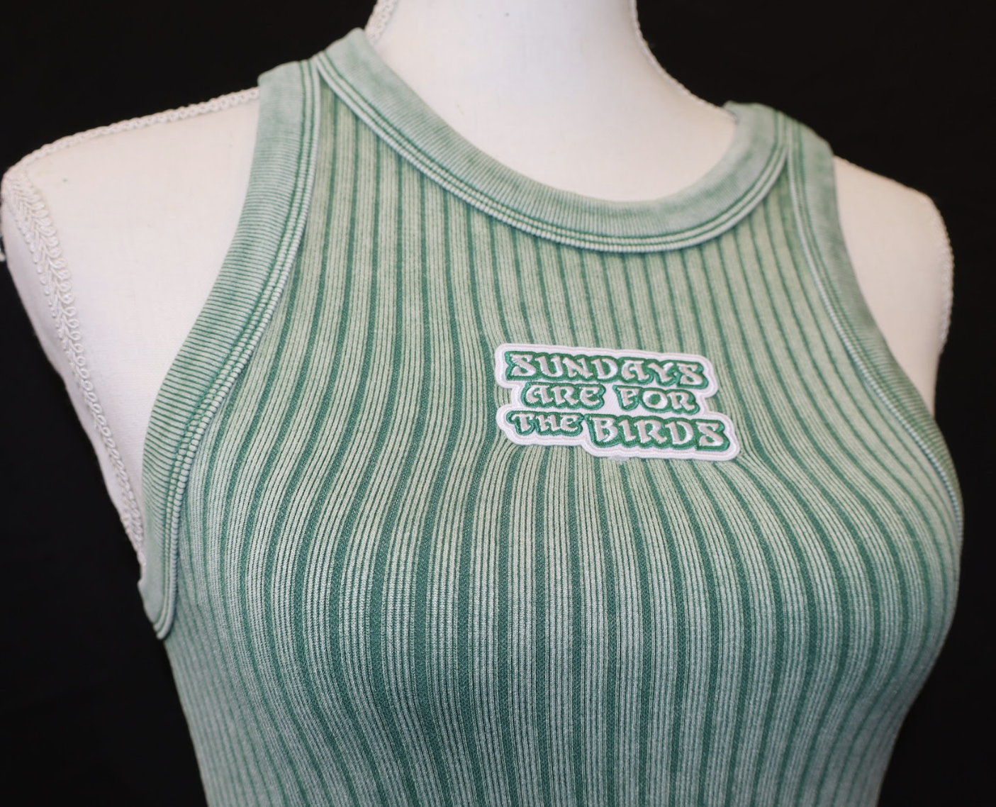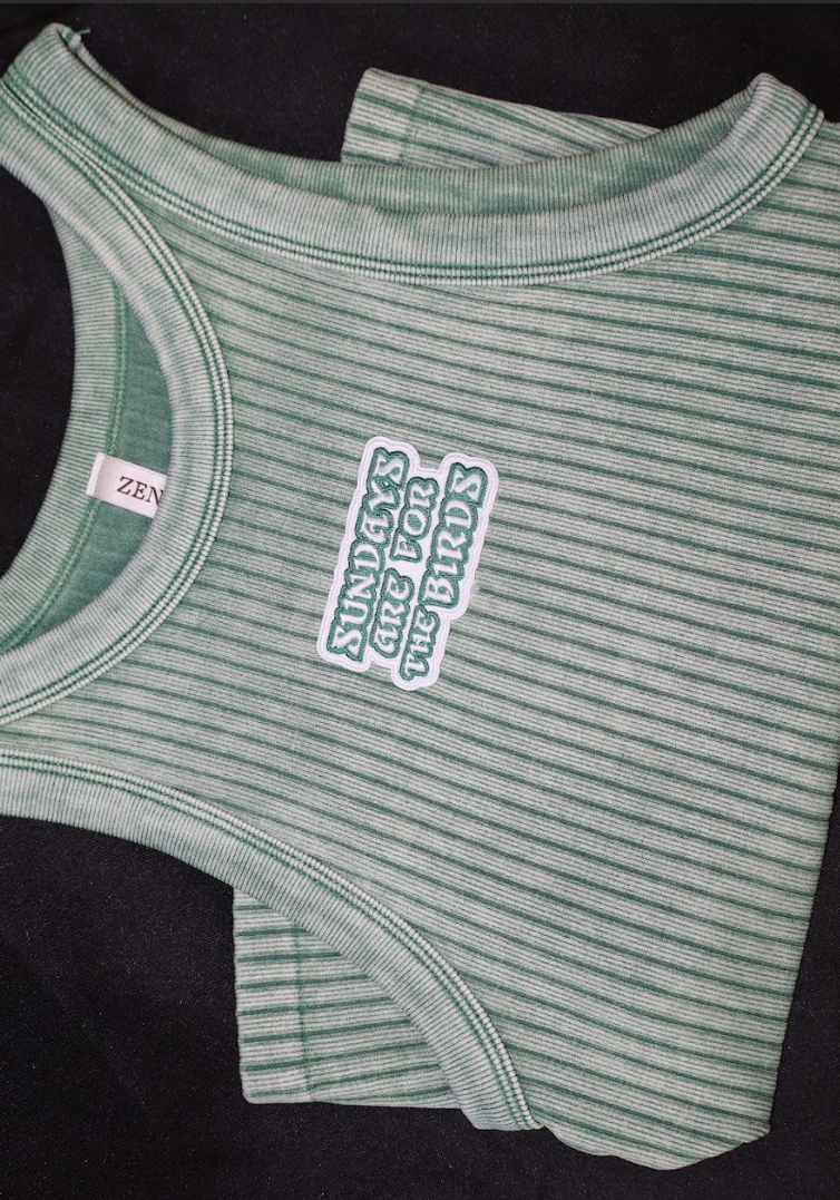 Embroidered “Sundays Are for the Birds” patch on chest